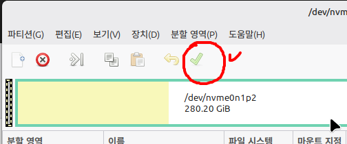 나는 이미 작업을 다 했기 때문에, linux-swap으로 표시가 되는데, 원하는 파티션을 선택해서 오늘쪽 클릭하거나, 위 메뉴에서 분할 영역>다음으로 포맷을 선택하면 linux-swap이 있고 이를 선택하면된다. Gparted는 변경사항을 바로 적용하지 않는다. 만약에 여러가지 변경사항을 만들었다면, 이걸 큐에 넣었다가 사용자가 승인했을 때, 한 번에 모든걸 실행한다.