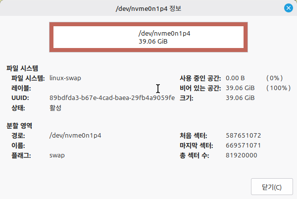 Kdenlive 로 영상편집 하는 튜토리얼 해보다가 렌더링을 돌렸는데, 램이 자꾸 부족하다는 경고 메세지가 떴다. 그렇게 큰 영상도 아니라서 일단은 Kdenlive를 오래 굴리면 이놈이 메모리를 잡아먹는 문제가 있는걸로 보임. 재시작 하니까 훨씬 적게먹긴해서 문제는 되지 않았다. 하지만, 저 경고 메세지가 뜬다는 자체가 문제. ‘어? 스왑파일이 없나?’ 오래전에 리눅스 설치시에는 각종 파티션을 사용자가 직접 잡아 설치하곤 했는데, 이 때 스왑영역도 잡았던 기억이 있다. 리눅스 민트는 그냥 설치 따라가면 통채로 루트로 마운트 하게 되는데, 아니 적어도 이러면 스왑파일은 자동생성 해줘야 하는거 아닌가 싶은거지. 현실은 스왑자체가 활성화 안된 상태다. 아무래도 언젠가 문제가 생길거 같아서 스왑파일을 만들려고 했는데, 내가 리눅스로 할당한 공간이 150기가다. 근데, 벌써 90기가가 사용중이라 스왑파일 만들면 공간부족 문제가 또 생길거 같았음. 그래서 일단, 스왑용 파티션을 따로 생성했다.
