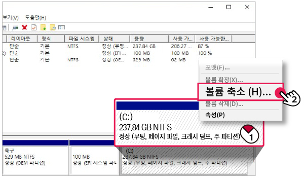 위 그림처럼 원하는 파티션을 선택해 오른쪽 클릭하여 “볼륨 축소”를 선택한다.
