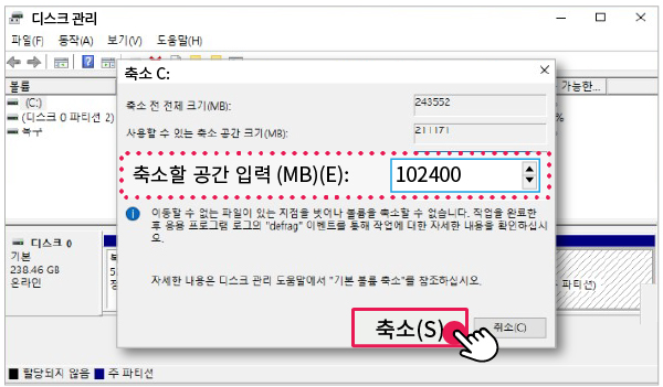 축소할 크기를 위 그림처럼 입력한 후, 축소를 하면 디스크를 정리해 기존 파티션을 축소하고 여유공간을 만들어준다.