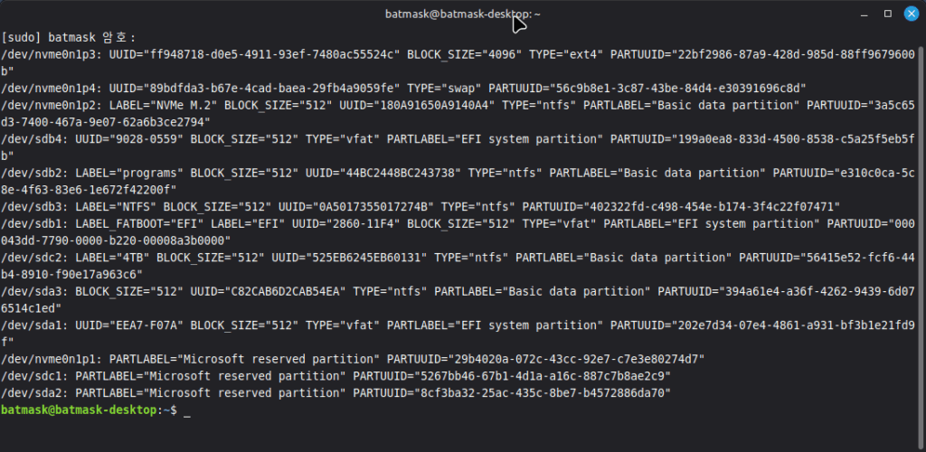 커맨드 라인으로 UUID 확인이 가능한 또 하나의 방법이 있는데, 바로 blkid 명령어이다. 이는 블럭 디바이스의 정보를 보는 명령어이다.