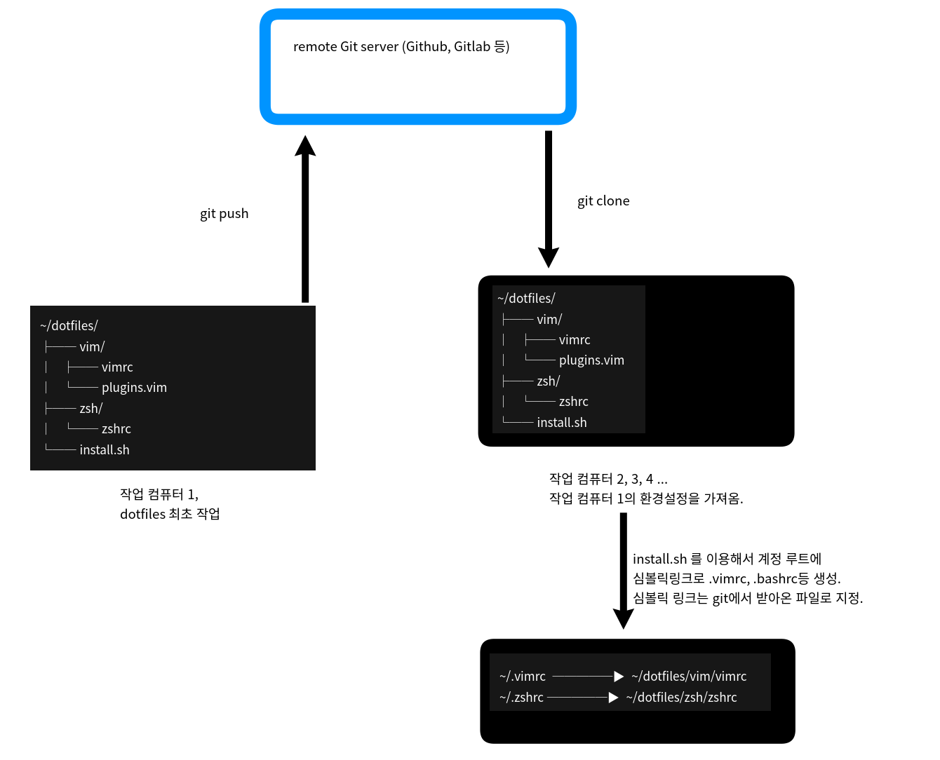 dotfiles 관리방법은 사실, vim에만 해당하는게 아니고 이름에서 연상할 수 있듯이 linux 설정파일들인 숨김파일, ‘.'(dot)으로 시작하는 파일들을 관리하는 방법이다. 당신이 사용하는 shell의 설정파일인 .bashrc 라던지, .zshrc등 평소 커스터마이즈해서 사용하는 터미널 환경설정들을 관리하는 방법이다.