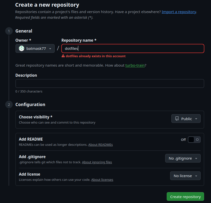 dotfiles로 생성했는데, 이미 만들어 놓은거라 위 이미지에서는 존재한다고 빨갛게 떠있다. .gitignore랑 README.md까지 만들었으므로 다 추가하지 않는 기본을 선택한다.