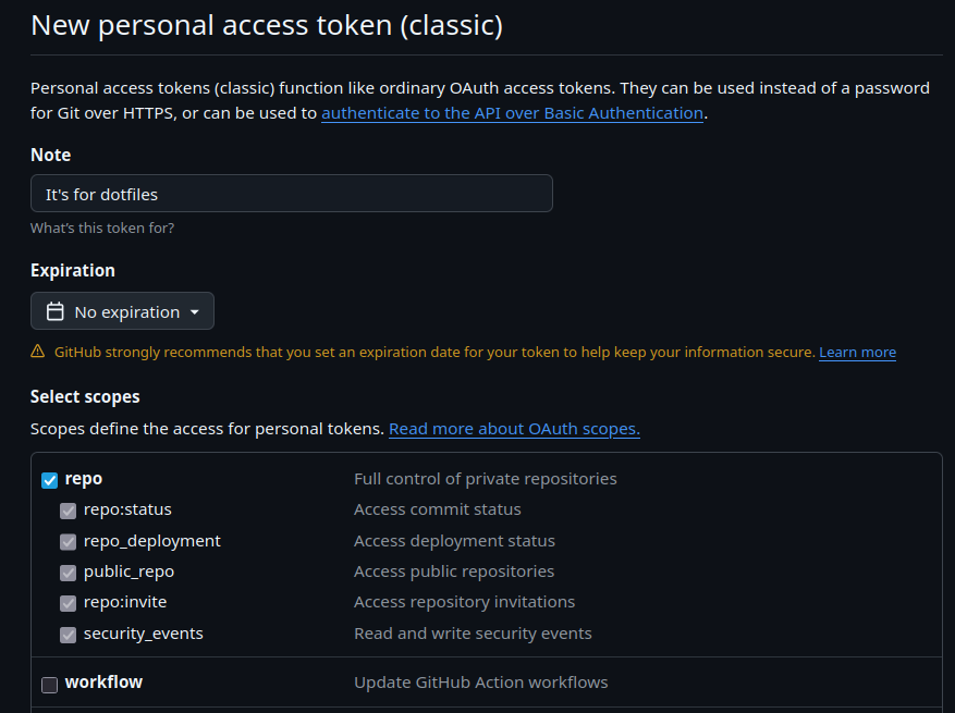 Generate new token 을 선택한 후, classic token을 선택한다. Fine-grained token에 대한 정보는 아직 부족해서 모르겠다. 화면에 많은 정보가 나오는데 일단, Note에 사용목적을 적고, expiration을 설정한다. 위험하다고 하지만, “no expiration”을 선택해서 기한 없이 사용도 가능하다. 그 밑으로는 각종 권한들이 쭉 나열되는데, github의 다양한 기능을 사용할게 아니고 그냥 repo만 이용할 것이기 때문에 repo만 선택해준다. 다음은 내가 선택한 예이다.